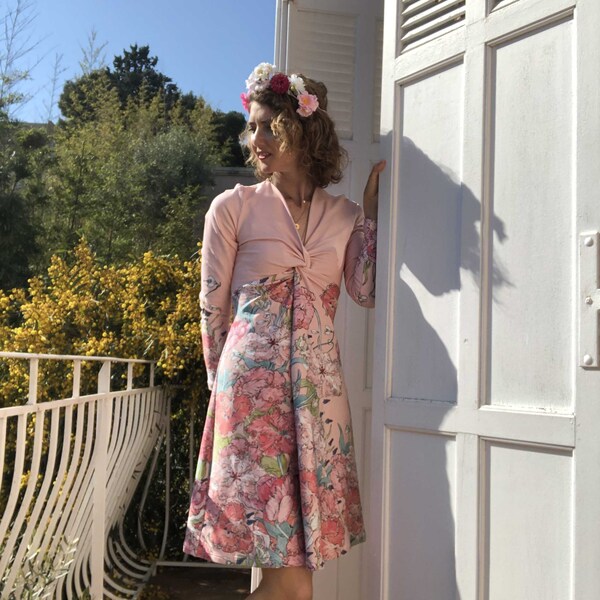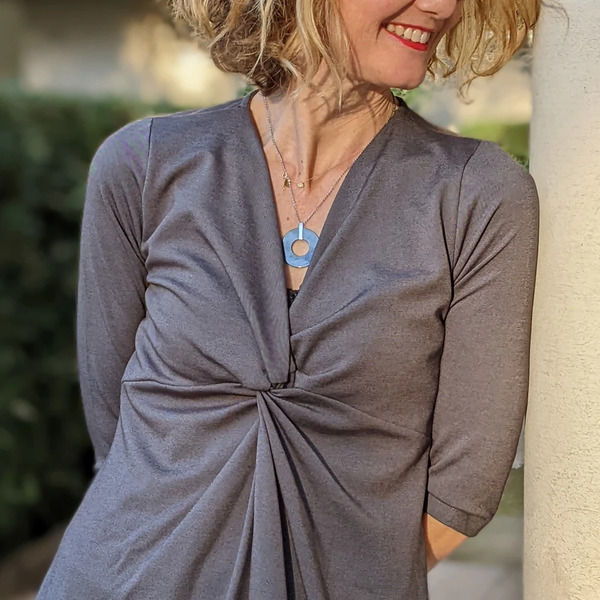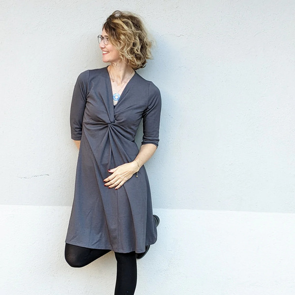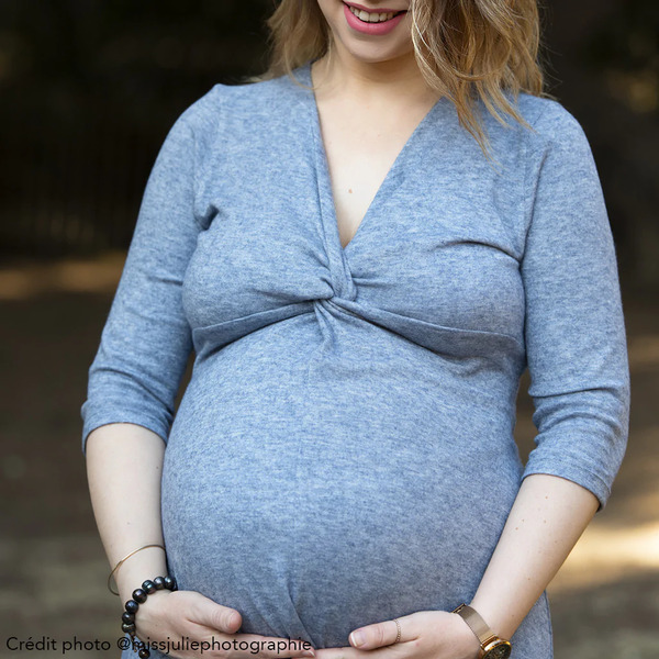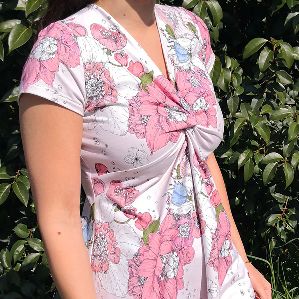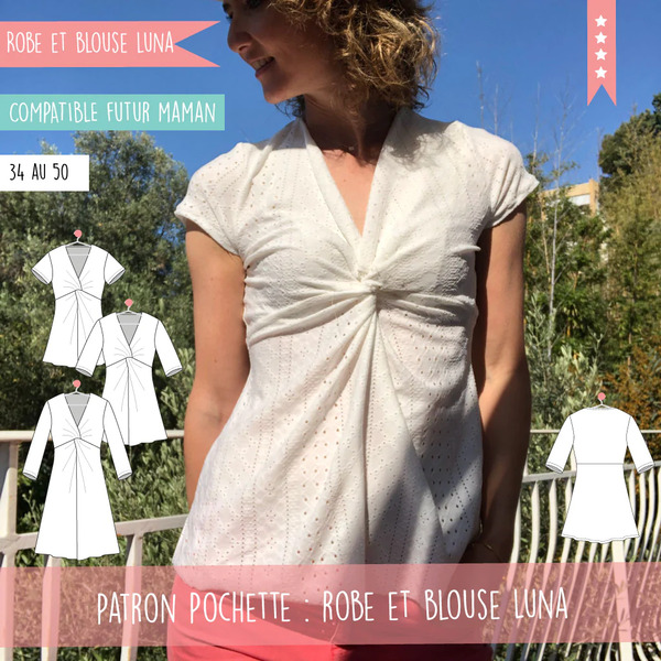 La découpe poitrine et le drapé sur le devant permet d’accueillir un ventre de grossesse jusqu’à son terme. L’allaitement est possible également grâce à son décolleté. Ce modèle est à réaliser en jersey souple exclusivement.